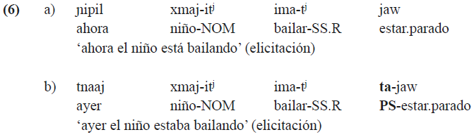 El aspecto progresivo, que se refiere a una situación que está en proceso y perdura por cierto tiempo, se expresa en KSJZ por medio de distintos verbos auxiliares que indican la posición del sujeto (‘estar parado’, ‘estar acostado’, entre otros) o sus propiedades físicas (‘estar en movimiento’, ‘ser audible’, entre otros). Las construcciones progresivas son las únicas que permiten la distinción temporal entre el presente y el pasado en el nivel gramatical, ya que los verbos auxiliares que se utilizan en estas construcciones pueden tomar el prefijo sintáctico ta-. Aunque el estatus morfológico y el significado exacto de este morfema todavía queda por aclarar,6 a modo de observación preliminar parece seguro decir que ta- se encuentra con mayor probabilidad en contextos de tiempo pasado que carecen de relevancia actual, y de esta manera permite contrastarlos con las formas en el presente (6).7