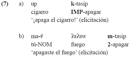 El ejemplo (7) ilustra dos formas del verbo transitivo tasip ‘apagar’ con el objeto directo en tercera persona. Se puede observar que el prefijo del imperativo k- en (7a) ocupa la misma posición en la palabra verbal que el prefijo de la segunda persona m- en (7b). Estos prefijos son mutuamente excluyentes, lo que apunta a que el KSJZ expresa el modo (indicativo no marcado vs. imperativo) en el marco del mismo paradigma que la persona gramatical.