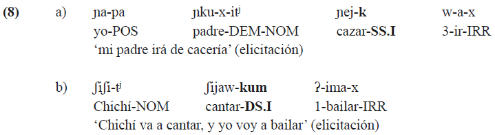 Los dos verbos en (8a) comparten el mismo sujeto; por lo tanto, el verbo ‘cazar’, que es sintácticamente dependiente en este contexto, aparece marcado por el sufijo -k. La situación en (8b) es diferente, ya que las dos cláusulas tienen distintos sujetos, lo que se marca por medio del sufijo -kum. En cambio, el sufijo -x solamente se emplea en cláusulas independientes, lo que también se observa en estos ejemplos donde dicho sufijo se agrega a los verbos ‘ir’ en (8a) y ‘bailar’ en (8b).