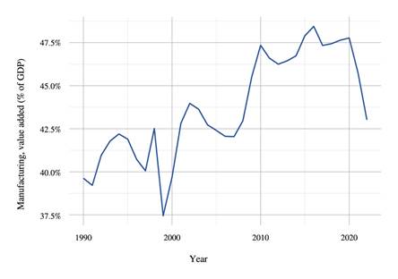 This tax regime played a crucial role in Puerto Rico’s economic performance for over 30 years since Caraballo-Cueto and Lara (2018) argue that during the moment of most success of Section 936, manufacturing represented 30% of deposits on local financial institutions, it represented 17% of total employment and represented 42% of Puerto Rico’s Gross Domestic Product (GDP). However, this tax regime was eliminated in 1996, and a 10-year phase-out period was established to allow an organized transition. Nevertheless, a substitute model was not established, and the island production capacity decreased significantly (Ríos, 2021), as evident in Figure 1.