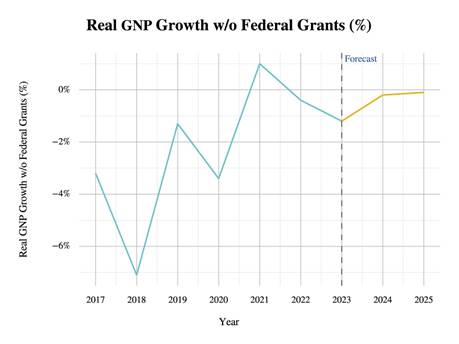 In Figures 2 and A2 of the appendix of this paper, it is possible to see that for the periods after the Global Financial Crisis and Hurricane María, the economy of Puerto Rico received massive injections of grants, and the level of these injections only occurred on extraordinary circumstances, because they are not recurrent grants/transfers. This reality has led many economists to argue that Puerto Rico is currently under a federal grants bubble that has led to ephemeral economic growth (Caraballo-Cueto, 2021), which led the Financial Oversight & Management Board for Puerto Rico (FOMB) to make a simulation where they extracted the effects of the federal grants on the Real Gross National Product of Puerto Rico (GNP) (FOMB, 2023). The simulation can be observed in Figure 3, from which it is inferred that without federal grants, the growth of Puerto Rico’s economy would be on negative values in all years except one of them, 2021.