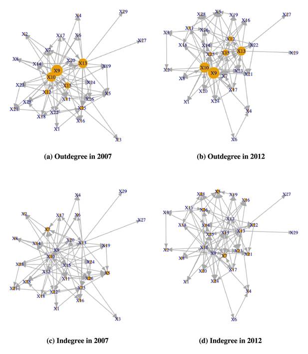 Under PageRank, a sector is considered significant if the sectors connected to it are important sellers or buyers. The sectors with high PageRank values were Mining (except Oil and gas) (X2), Other Mining Products (X3), Natural Gas and Healthiness Services (X5), New Construction (X7), Commerce (X10), Arts and Sports Spectators (X21), Food Services (X25), Other Services (X26), and Municipal Government (X28). Also, the Betweenness Centrality measure made it possible to identify the communities within the network. For 2007, two communities were identified. Our first community was made up of New Construction (X7), Communications (X12), Finance and Insurance (X13), and Real Estate (X14), and the second community was made of Manufacturing (X9), Commerce (X10), Transportation (X11), Technical and Professional Services (X15), Social Services and Health Care (X20), Other Recreational Services (X23), Housing Accommodation (X24), and Other Services (X26). In the case of 2012, most of the sectors were together in the same community.