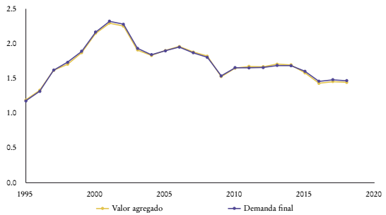 En cuanto al origen sectorial de Y, se reportan en promedio 2.6, 35.4 y 62.1% provenientes del sector primario, secundario y terciario, respectivamente. Las participaciones en la Y no han cambiado drásticamente; el sector primario pasó de 2.5 a 2.9%; el secundario de 36.9 a 35.5%, y el terciario de 60.7 a 61.6%. En las manufacturas, su participación en la Y se redujo de 23.8 a 21.4%. Por sectores, el VA doméstico en la Y de uso nacional registró en promedio en el sector primario 81.9%, en el secundario 64%, 85.5% en el terciario y 54.4% en las manufacturas.
