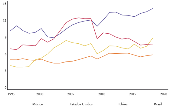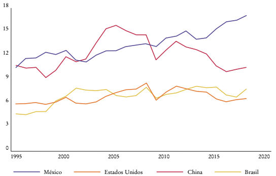 En cuanto al índice de participación de vínculos hacia atrás de CGV (GVCPtb), México destaca por mantener valores superiores a los de economías como las de los Estados Unidos y Brasil durante todo el periodo de estudio. México se había mantenido cercano a los valores del índice para China, y después de 2009 también ha superado a esa economía. A diferencia del índice de vínculos hacia adelante, al tener en cuenta todos los países que se incluyen, México ha pasado del lugar 48 en 1995 con un índice de 10.1% al lugar 36 en 2018 con 16.7%. En este periodo el país ha incrementado el porcentaje de productos finales producidos por los sectores que provienen de actividades de CGV. Vale la pena comparar la posición de México en relación con otras economías. Por ejemplo, en 2018 en las primeras posiciones se encuentran Luxemburgo, Malta, Vietnam y Singapur, cuyas principales exportaciones son manufacturas con concentraciones7 de 82.7, 85.4, 86 y 80.1%, respectivamente; mientras que sus principales importaciones son de 71.9, 68.4, 79.7 y 73%, respectivamente. México también concentra sus exportaciones e importaciones de mercancías en manufacturas con 79.1 y 78.6%. En estas economías gran parte de la producción se ve involucrada o proviene de CGV.