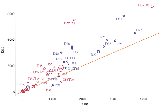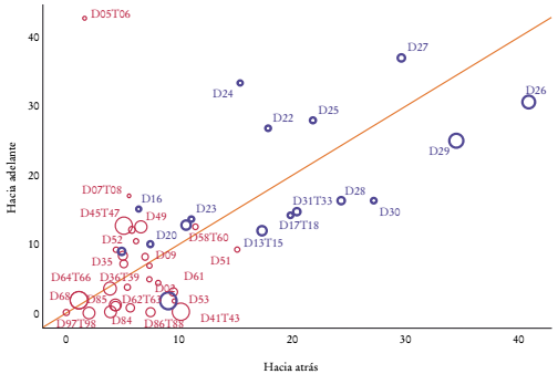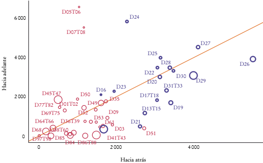 En lo que se refiere al índice de participación de vínculos hacia atrás, entre 1995 y 2018 en promedio los sectores tuvieron incrementos de 7.7 puntos porcentuales, y al agrupar entre sectores manufactureros y no manufactureros, en los primeros el aumento fue de 12.0 puntos porcentuales y en los segundos, de 5.1. La Gráfica 5 muestra que en la mayoría de los sectores creció este indicador (se encuentran por arriba de la línea de 45°), lo que da cuenta de que se ha incrementado el porcentaje de productos finales producidos por estos sectores de México que provienen de actividades de CGV (insumos intermedios importados en la producción y las exportaciones). Aquí, los 10 sectores con mayores aumentos en el indicador GVCPtb van desde D19, coque y productos refinados del petróleo (29 puntos porcentuales), hasta D03, pesca y acuicultura (10.8 puntos porcentuales).