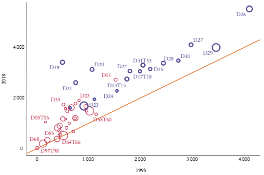 Adicionalmente, es relevante observar cómo cambian los índices al comparar el inicio con el final del periodo. Para el índice de participación de vínculos hacia adelante (insumos del país en terceros países), entre 1995 y 2018 en promedio los sectores registraron incrementos de 5.8 puntos porcentuales, y, si se distingue entre sectores manufactureros y no manufactureros, en los primeros el incremento fue de 8.9 puntos porcentuales y en los segundos, de 4. La Gráfica 4 muestra que en la mayoría de los sectores se incrementó este indicador, lo que señala que en éstos tienden a predominar las exportaciones de bienes primarios o intensivos en recursos naturales, o son importantes proveedores de materias primas y componentes o bienes intermedios. Esto se corrobora al listar los 10 sectores con mayores incrementos en el indicador GVCPtf: desde D07T08, explotación de minas y canteras, productos no energéticos (38.1 puntos porcentuales), hasta D26, equipos informáticos, electrónicos y ópticos (8.5 puntos porcentuales).