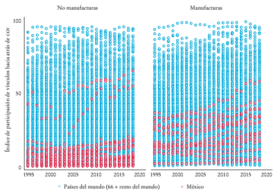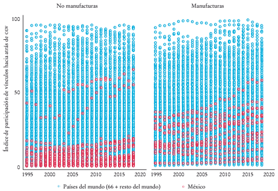 En el índice de participación de vínculos hacia atrás, entre 1995 y 2018 en promedio los sectores tuvieron incrementos de 7.7 puntos porcentuales, y, al agrupar entre sectores manufactureros y no manufactureros, en los primeros el incremento fue de 12 puntos porcentuales y en los segundos de 5.1. Lo anterior indica que se ha incrementado el porcentaje de productos finales producidos por estos sectores mexicanos que provienen de actividades de CGV, particularmente en las manufacturas.