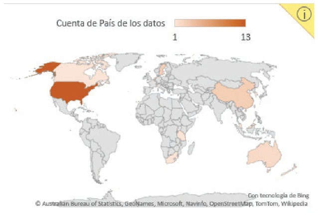 La identificación y análisis de 35 reportes de investigación sobre programas de DPD en matemática incluyó artículos publicados entre 2008 y 2020, de los cuales solo 8 datan entre 2008 y 2014, mientras que entre 2015 y 2020 su cantidad aumentó en gran medida, sumando 27 estudios. Los países de donde provienen los estudios empíricos son 17 e incluyen los 5 continentes. La mayoría de los estudios proviene de Estados Unidos, país del que se identificaron 13 trabajos (ver gráfico 2), seguidos por Suecia y China con 3 trabajos cada uno.