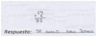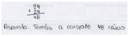 | Identifica una relación multiplicativa (estrategia constructiva). El estudiante se da cuenta de que la relación entre las cajas cargadas por Pedro y Tomás es del doble (6 + 6 = 12) y la utiliza para obtener las cajas de Tomás (24 + 24 = 48). |