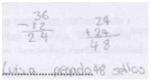 | Identifica una relación aditiva. El estudiante identifica que la relación entre los sellos pegados por Laura y Luis es aditiva -con una diferencia de 24 sellos (36 − 12 =24). Utiliza esta diferencia para obtener los sellos pegados por Luis (24 + 24 = 48) |