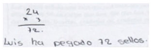 | Identifica una relación multiplicativa (enfoque funcional). El estudiante identifica que la relación entre los sellos pegados por Laura y Luis es del triple (12 × 3 = 36) y la utiliza para obtener los sellos pegados por Luis (24 × 3 = 72). |