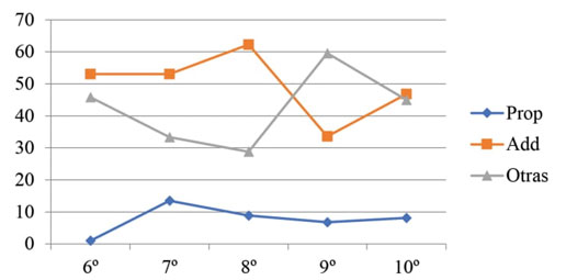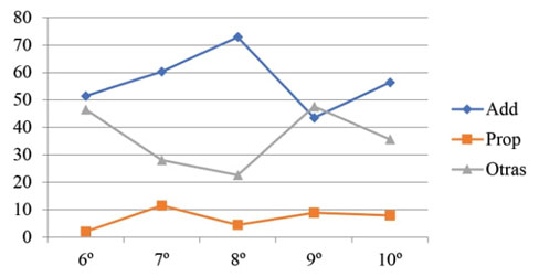 Figura 2 Problemas aditivos: Uso de las estrategias aditivas (Add), proporcionales (Prop) y otras (Otras) a lo largo de los grados. Fuente: elaboración propia.
