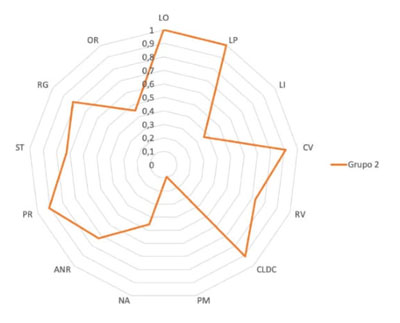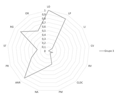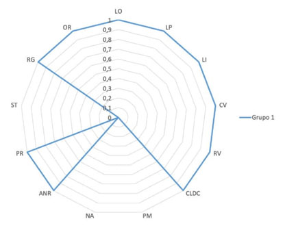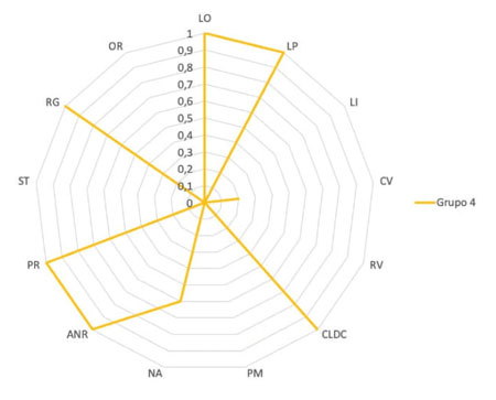 El análisis clúster permitió identificar cuatro grupos. En el primer perfil (figura 17), que solo agrupa al 11% (4 estudiantes), se caracteriza porque los estudian-tes manifiestan que el límite es tanto un objeto (LO) como un proceso (LP), relacionan límite con imagen (LI), coordinando las variables (CV), haciendo referencia a ambas (RV) y mencionando condiciones de lateralidad y doble convergencia (CDLC). Para representar el límite usan tanto representaciones gráficas (RG) como otras representaciones (OR). Para estos estudiantes el límite es no rebasable (ANR) y proporcionan expresiones que manifiestan la posicionalidad relativa (PR). Es decir, expresan un significado de límite rico en elementos de estructura conceptual, representación y sentido. Llamaremos a este perfil “Significado Completo”.