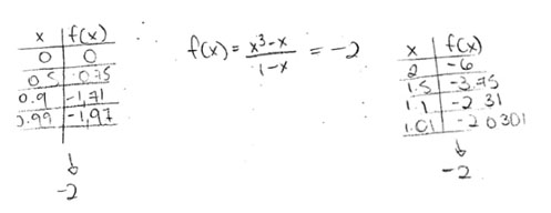 A continuación, para ejemplificar la codificación, mostramos las respuestas del estudiante EBM1313 a las preguntas que le hemos realizado en el cuestionario. Al responder a la primera pregunta (figura 1), el estudiante evidencia la categoría Límite como Objeto (LO), ya que indica que el límite es el punto. No obstante, es en la pregunta 2, cuando observamos las categorías: Límite como Proceso (LP) debido que se observa un proceso de aproximación; Coordinación entre las Variables y (CV) ya que hay relación de la variable independiente con la variable dependiente a través de procesos de aproximación; Condiciones de Lateralidad y Doble convergencia (CLDC), pues evidencia que por derecha e izquierda el límite debe ser -2; Términos de Posición Relativa (PR) debido a que muestra diferentes preimágenes tanto a la izquierda como a la derecha de 1; y finalmente evidencia la categoría Otra Representación (OR), ya que utiliza una representación tabular (figura 2).