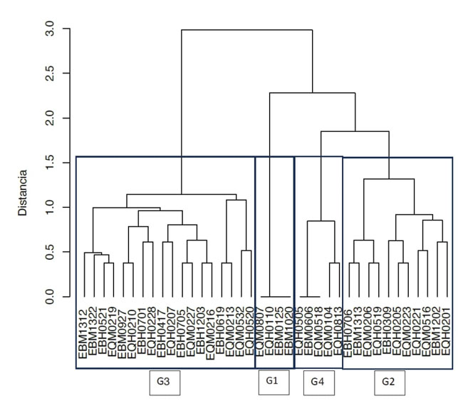 Para poder interpretar de manera apropiada y organizada los grupos, se realizó un corte a una distancia en la que se forman cuatro grupos: G1 corresponde al primer perfil, G2 al segundo perfil, G3 al tercer perfil y G4 corresponde al cuarto perfil. Como investigadores utilizamos un criterio observacional para elegir los 4 grupos, pues consideramos que podían explicar mejor los conglomerados. No hubo un criterio métrico. Como se puede apreciar en la figura 8, en el dendrograma se observa la jerarquía de los grupos. Y se aprecia también qué estudiantes pertenecen a cada grupo o perfil.