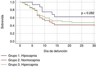 En el análisis de variables gasométricas y ventilatorias por grupo, la media de PaCO2 fue 31.44 ± 3.11 mmHg, 39.45 ± 2.80 mmHg y 57.02 ± 10.55 mmHg para el grupo de hipocapnia, normocapnia e hipercapnia, respectivamente. La media de pH fue 7.41 ± 0.07 para el grupo 1, 7.39 ± 0.07 en el grupo 2 y 7.26 ± 0.09 para el grupo 3. La media de HCO3- fue 20.9 ± 3.17 mmol/L, 24.12 ± 4.36 mmol/L y 25.91 ± 5.33 mmol/L para los grupos 1, 2 y 3, consecutivamente. La media de PEEP fue: 8.63 ± 0.95 cmH2O, 8.44 ± 0.83 cmH2O y 9.00 ± 1.25 cmH2O para los grupos 1, 2 y 3, respectivamente. Las variables anteriores mostraron diferencia estadística. El resto de las variables se describe en la (Tabla 2).
