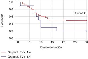 La eliminación del CO2 es tan importante como la mejoría de la oxigenación en los pacientes con SDRA. El reclutamiento de unidades bien perfundidas, pero mal ventiladas mediante presión transpulmonar positiva, favorece la eliminación del CO2. La EV es un parámetro sencillo que valora la ventilación alveolar. Su valor normal es ~ 1, sin unidades. La EV tiene correlación positiva (r = 0.66; p ≤ 0.0001) con espacio muerto.6 En pacientes con SDRA, la EV es mayor en no sobrevivientes comparado con los sobrevivientes (2.02 ± 0.8 vs 1.75 ± 0.5; p ≤ 0.001), la EV es un predictor independiente para mortalidad. En pacientes con COVID-19 que requieren VMI, el incremento de la EV desde el ingreso a UCI con respecto al día tres está asociada con mortalidad (OR 1.4, IC95% 1.01-1.07; p = 0.030); independientemente de las variaciones de la PaO2/FiO2 (OR 0.99, IC95% 0.95-1.02; p = 0.47).22 El espacio muerto podría predecir mortalidad en enfermos con SDRA;23 sin embargo, en nuestra población de pacientes, la EV > 1.4 no tiene significancia estadística.