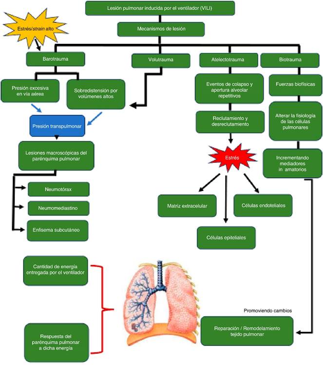 Se han descrito cuatro mecanismos de lesiones pulmonares atribuibles a ventilación mecánica: barotrauma, volutrauma, atelectotrauma y biotrauma; y recientemente se reconoció que la heterogeneidad regional, la frecuencia del estrés y la fuga capilar pulmonar también contribuyen al desarrollo de dicha lesión (Figura 1).6