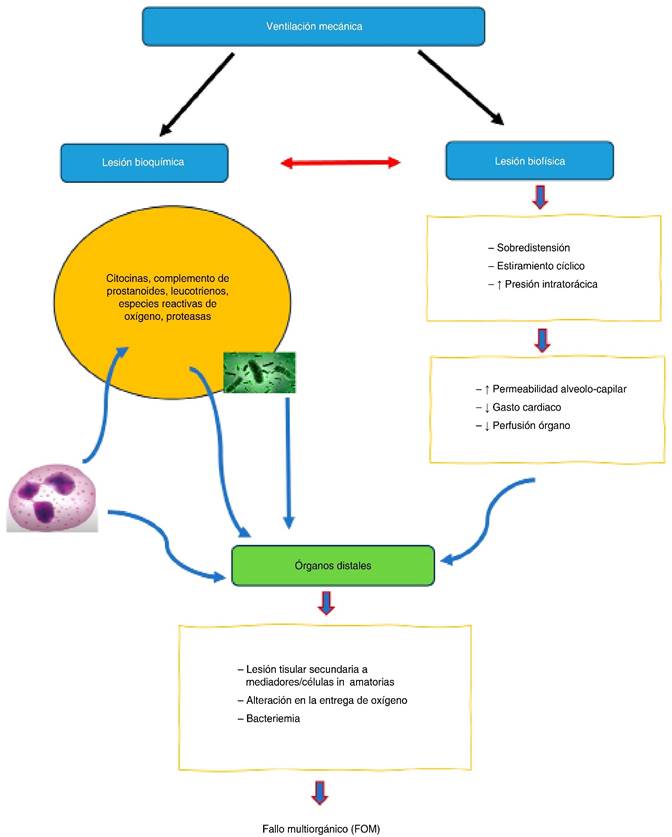 Figura 2: Ventilación mecánica y sus efectos en el desarrollo de fallo multiorgánico (FOM ), mediante sus mecanismos biofísicos y bioquímicos.