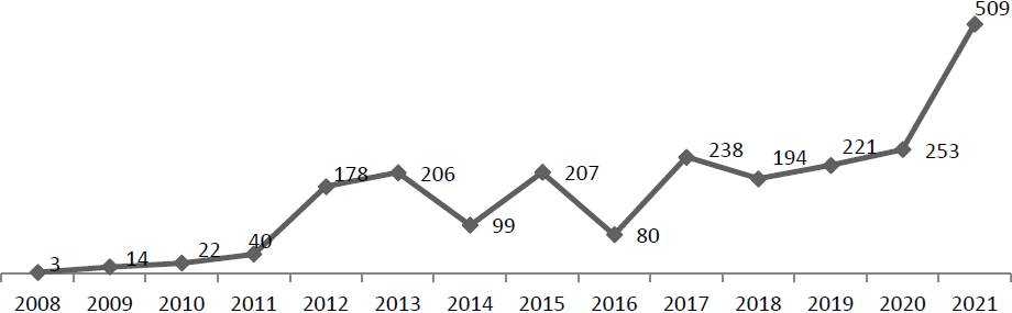 Gráfica 1 Solicitudes de información sobre tecnologías de vigilancia en México 2008-2021