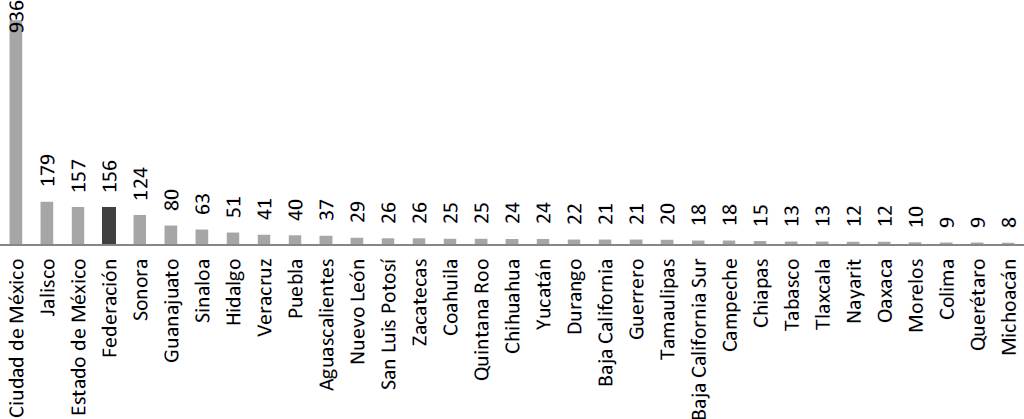 Después de la Ciudad de México, el mayor número de solicitudes de información se realizaron en Jalisco y Estado de México, donde también coincide que son las entidades federativas en las que se concentra el mayor número de tecnologías de vigilancia pública declaradas por los respectivos gobiernos estatales (INEGI, 2020). En cuarto lugar, las solicitudes se dirigieron hacia la Federación (Gráfica 2).