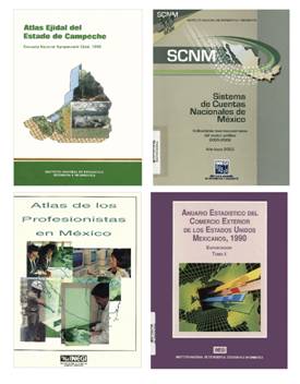 La Mapoteca también conserva del INEGI publicaciones de gran formato colocadas en una estantería especial (Imagen 5), entre ellas el Anuario estadístico del comercio exterior y las publicadas por la Dirección de Estudios del Territorio Nacional, dependiente de la Secretaría de Programación y Presupuesto, sobre la instrumentación de los Sistemas de Cuentas Nacionales de Naciones Unidas, certificada por el Fondo Monetario Internacional.23 Por otra parte, son dignos de mención el Atlas de los profesionistas en México24 -de gran utilidad para los formadores de recursos humanos, ya que permite conocer sus características sociales y su distribución en el país, junto con el promedio de sus ingresos- y el Atlas Ejidal por estado,25 que da cuenta de la localización geográfica y usos agrícolas.