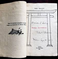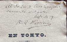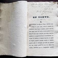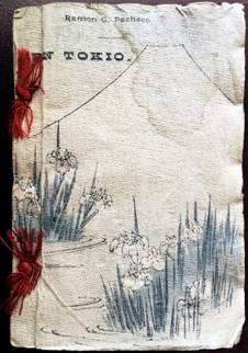 Pacheco, Ramón G. En Tokio. [Tokio]: s. p. i., s. f. i. [¿1899?]. Port. grabada en madera, + 1 h. en blanco + 26 folios con caracteres occidentales, impresos por un lado, doblados por la mitad, que arrojan un total de 52 pp. impresas por un lado con numeración seguida y a su reverso 52 pp. en blanco + 2 h. en blanco, una de las cuales funciona como cubierta posterior. Dedicatoria manuscrita del autor en la primera página. La portada presenta una mancha de humedad que afecta al grabado en su ángulo superior derecho.30