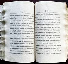 Por lo general, estos chirimen-bon venían ilustrados, tanto en sus portadas como en su interior, con ilustraciones a color hechas a partir de grabados en madera originales, en un estilo llamado ukiyo-e.31 En el caso del libro de Pacheco la única ilustración es el grabado en madera de la portada, el cual aparece sin firma. Está encuadernado en una variante del estilo tradicional japonés llamado fukuro toji (encuadernación fukuro), formado por pliegos impresos por un solo lado con el texto de dos páginas, plegadas de tal forma que el texto impreso de cada página queda por fuera, y el interior del pliego doblado queda en blanco. Los pliegos así doblados se apilan uno sobre el otro y quedan unidos en el lomo con una delgada capa de papel con pegamento. Los folios apilados se unen por su extremo abierto mediante una costura con un cordón de seda que se hace pasar a través de dos agujeros en cada extremo, y finalmente se anuda por el frente para evitar que se salga de las costuras. Con ello se dejan los bordes externos del libro cerrados, y así el el lector no tiene que enfrentar páginas en blanco al tornar las páginas impresas. A diferencia de esta encuadernación estilo fukuro-toji tradicional, en el ejemplar que describimos los pliegos apilados están cosidos por su extremo "cerrado", haciendo que a dos páginas enfrentadas con texto impreso le sigan dos páginas en blanco, lo que hace de éste un libro con 52 páginas impresas y el mismo número de páginas en blanco, más las guardas (Figuras 2 a 5).32