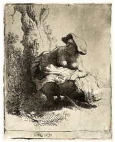 Imagen 1. Juan Sabey fue denunciado por mandar pintar la imagen de una mujer en actitud de orinar, similar a la de Rembrandt, A Woman Making Water, RHL (monograma) 1631, aguafuerte, 81 x 64 mm. Colección de Rijksmuseum.