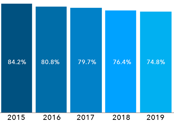 Figura 1: Población lectora. Fuente: INEGI. Módulo sobre Lectura 2016 a 2020. Porcentaje de la población de 18 y más años de edad alfabeta que lee algún material considerado por MOLEC. Serie 2015 a 2019.
