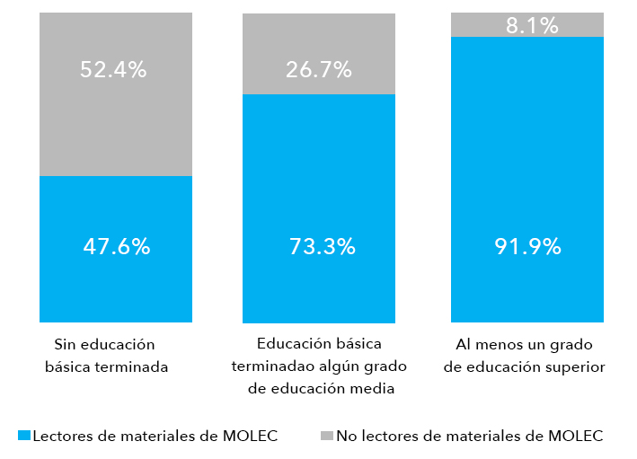 Figura 2: Lectores por nivel de estudios. Fuente: INEGI. Módulo sobre Lectura 2020. Distribución porcentual de la población alfabeta de 18 y más años de edad por condición de lectura de los materiales de MOLEC, según nivel de escolaridad.