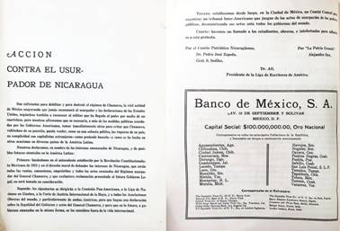 En cuanto a las colaboraciones, el contenido de todos los números reitera el propósito de difusión intercontinental, como lo ejemplifica un artículo de opinión de corte antiimperialista presente en un segundo número. El recorte “Acción contra el usurpador de Nicaragua”, dedicado a denunciar el régimen del general Emiliano Chamorro y sus planes de concesión extranjera, fue firmado por el Dr. Atl como presidente de la Liga y Alejandro Sux como representante de “La Patria Grande”, en alianza con el Comité Patriótico Nicaragüense, representado por Pedro José Zepeda, embajador de Nicaragua en México, y el general S. Sedilles. Al texto se le da total relevancia, ya que abre la edición y está acompañado, en su segunda página, por un anuncio del Banco de México que abarca la mitad de la hoja. Con este gesto, el editor pretendió dar validez, peso y respaldo al comunicado.