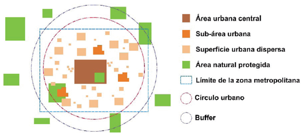 En el SIG se elaboró un polígono denominado “círculo urbano”, el cual se trazó alrededor de la superficie urbana de cada zona metropolitana (incluye superficie urbana dispersa) y funcionó como primera zona de influencia. A partir de ese círculo se definió una segunda zona de influencia con base en un buffer de 30 km (Figura 3); el tamaño del buffer se definió según el crecimiento de la superficie urbana de los 10 años de análisis. Después se contabilizó el número de ANP que entraron en el círculo urbano y en el buffer, este proceso consideró que más de una zona metropolitana puede afectar una misma ANP. Una vez definido el número de ANP próximas o dentro de las zonas metropolitanas fue necesario utilizar la Ecuación 6 para calcular el promedio de ANP susceptibles, 2010-2020.