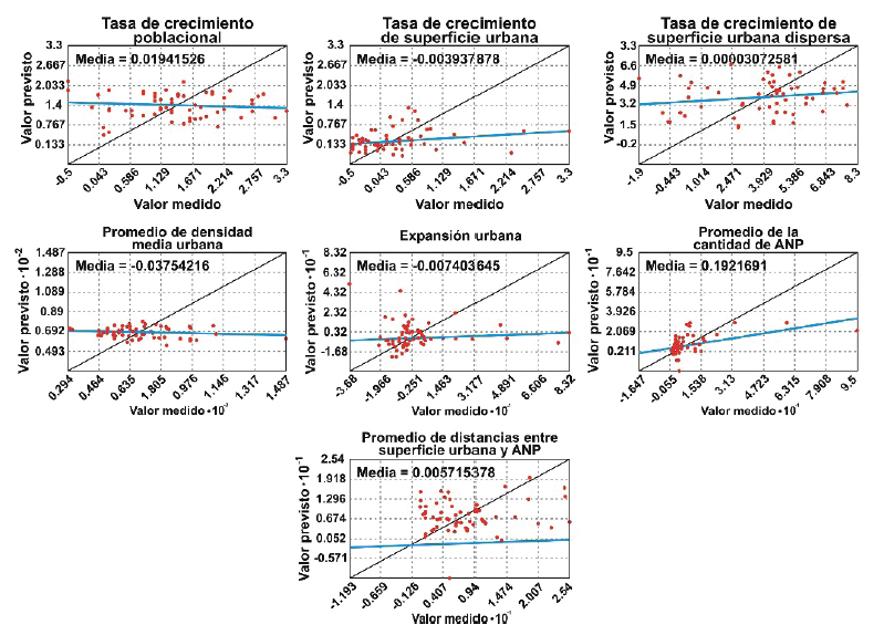 En la construcción del índice de presión urbana sobre ANP, se identificaron patrones entre indicadores que representan la confiabilidad de los datos, pues se observó una adecuada correlación espacial expresada por el valor medio próximo a cero, mientras que la distribución de los datos se presentó, en lo general, de manera óptima, con excepción de la superficie urbana dispersa (Figura 5).