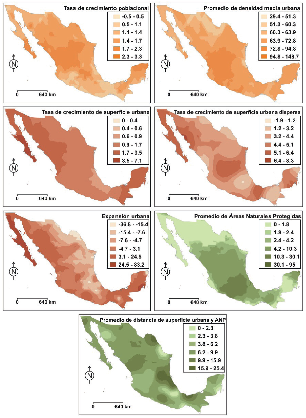 Por su parte, la interpolación de las tasas y promedios demostró que la relación entre crecimiento poblacional y superficie urbana es directamente proporcional al resto de los indicadores, además, destaca el centro del país con la mayor concentración de ANP, y la menor distancia entre superficie urbana y ANP (Figura 6). Existe una sutil relación entre superficie urbana dispersa y expansión urbana, por lo mismo, no se consideraron en el índice, porque al prescindir de ellos el coeficiente de Cronbach en la prueba de fiabilidad fue adecuado (0.714).