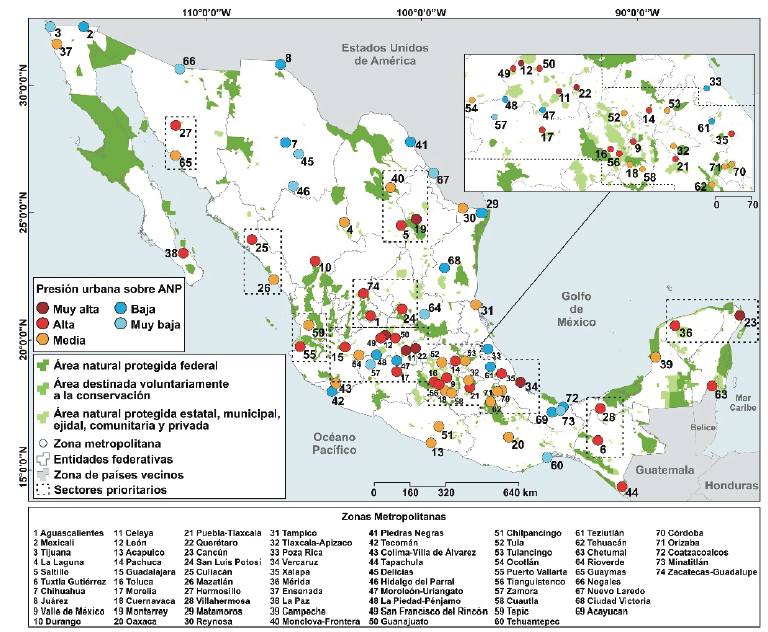 Por otro lado, se distinguen siete zonas metropolitanas en el sector norte del país, tres grandes (Saltillo, Monterrey y Culiacán), dos medianas (Durango y Hermosillo) y dos pequeñas (La Paz y Zacatecas-Guadalupe), las cuales suman 9,698,972 habitantes, 1906 km2 de superficie urbana y ejercen presión sobe 14 ANP-FED y 39 NAP-EMECP. Por último, se observan seis zonas metropolitanas en el sector sur, una grande (Mérida), tres medianas (Tuxtla Gutiérrez, Cancún, Villahermosa) y dos pequeñas (Tapachula y Chetumal), y suman 4,519,812 habitantes, 972 km2 de superficie urbana y presionan a 23 ANP-FED y 37 ANP-EMECP.