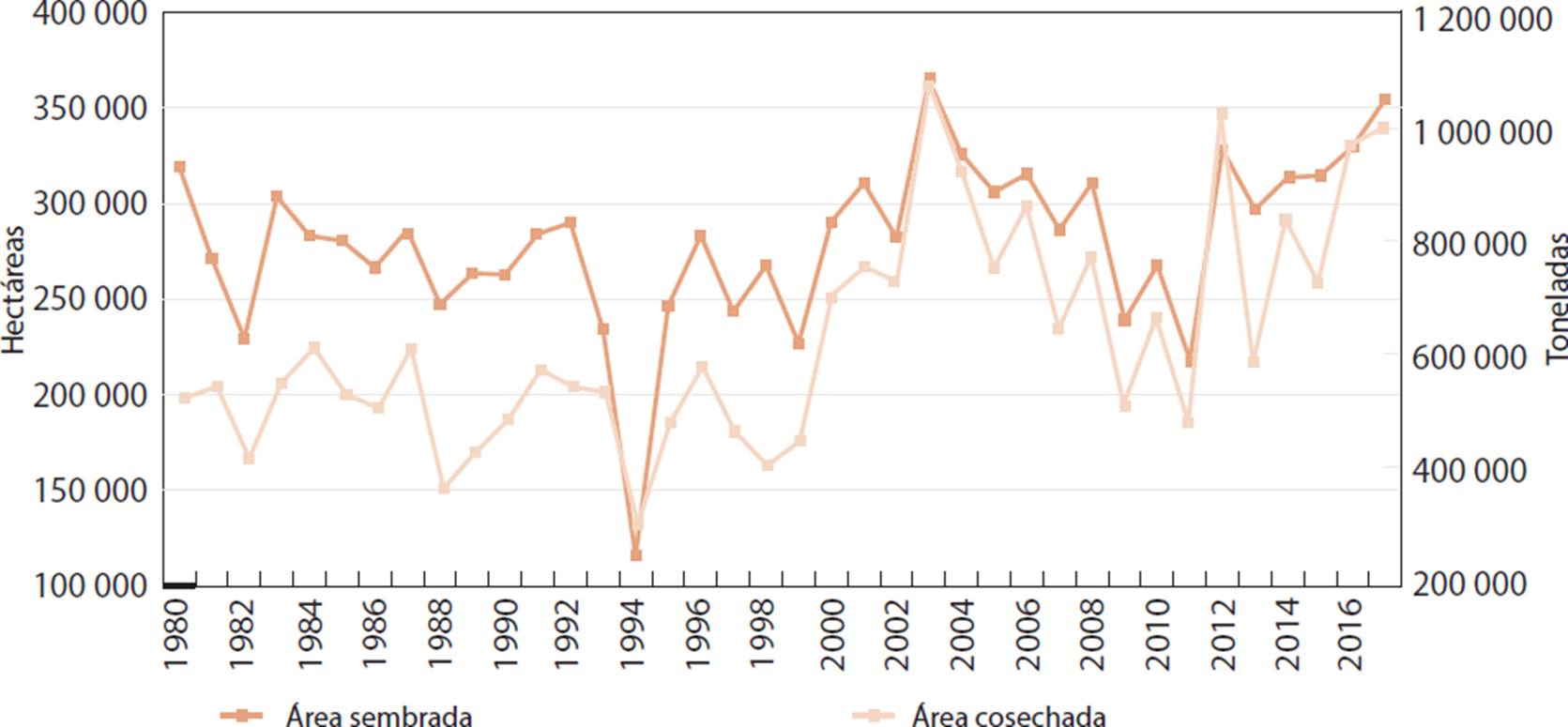 De acuerdo con datos del Sistema de Información Arancelaria Vía Internet (SIAVI), de la Secretaría de Economía, las importaciones que continúan haciéndose provienen principalmente de Estados Unidos, Canadá y Francia, países con los que México ha firmado tratados comerciales que le permiten no pagar aranceles. Asimismo, el Servicio de Información Agroalimentaria y Pesquera (SIAP) informó en 2016 que 93.07 % de los requerimientos de la industria se pudieron cubrir con la producción nacional, que se encontraba mecanizada en 97 %, aunque la asistencia técnica solo beneficiaba al 32 % de la superficie cultivada; esto y las condiciones climatológicas son una de las explicaciones del desfase que existe entre la cantidad de hectáreas sembradas y la de hectáreas cosechadas, de acuerdo con los datos de la Gráfica 3.