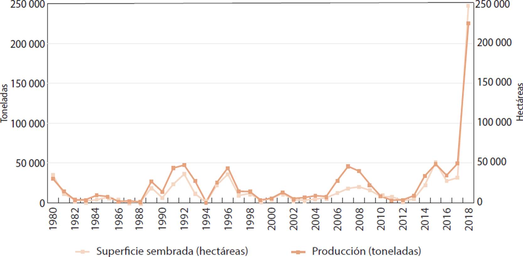 En la Gráfica 4 se puede ver que la superficie sembrada con cebada y los volúmenes de producción han evolucionado en Zacatecas de 1980 a 2018. Como se observa, hasta 2014 no existía una clara tendencia de crecimiento. En 2015 se sembraron 50 473.98 hectáreas con este cultivo, lo que representa más de dos veces la superficie sembrada con cebada el año anterior. Sin embargo, este incremento se perdió en 2016, para recuperarse parcialmente en 2017, cuando se registraron 31 457 hectáreas sembradas con cebada en Zacatecas.