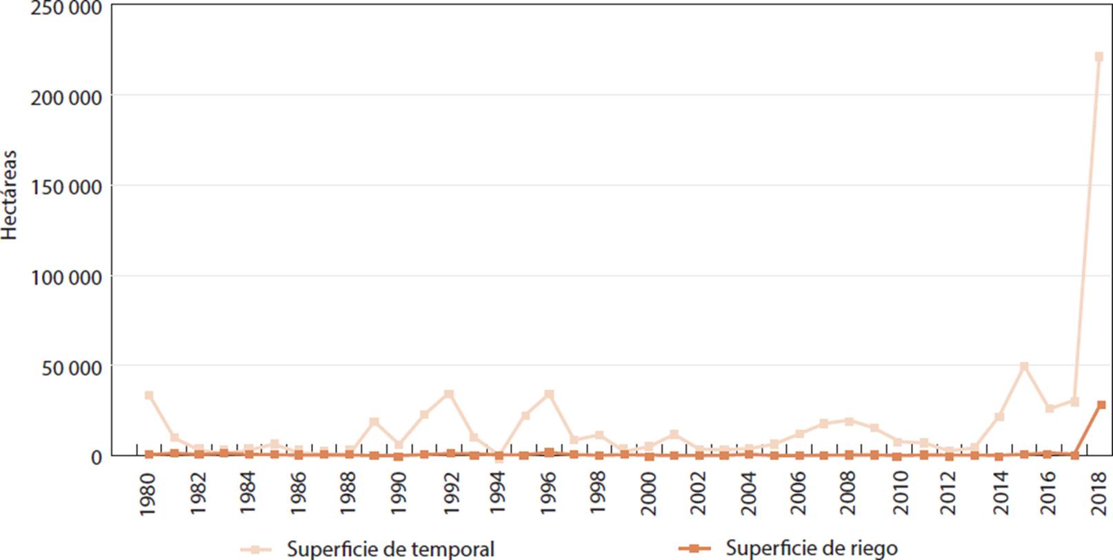 En la Gráfica 5 se contrasta la superficie de temporal destinada a la producción de cebada en Zacatecas con la superficie de riego dedicada al mismo cultivo. En ella se evidencia que aproximadamente 90 % es de temporal. En 2018, un año después de hacer grandes inversiones públicas y privadas en los programas de reconversión, se registraron 27 254 hectáreas de riego sembradas con cebada en el estado.
