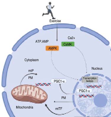 Figure 1: Regulation of mitochondrial biogenesis by HIIT training. 1) During endurance activity, an acute increase in the intracellular concentration of Ca+, ADP, and AMP and a decrease in the concentration of glycogen in contracting muscles is observed. High concentrations of ADP and AMP induce phosphorylation of AMPK, while high concentration of Ca+ causes autophosphorylation of CaMK through the protein calmodulin. This dual activation of AMPK and CaMK regulates transcription factors that modulate PGC-1alpha gene expression, a crucial step in the regulation of mitochondrial biogenesis. 2) AMPK, p38, Gen5, and siRNA, as kinases and acetylation modulators, carry out the phosphorylation and deacetylation of PGC-1a, thus enhancing its activity. 3) The activated form of PGC-1a associates with chromatin regulatory factors, triggering the opening of chromatin to facilitate transcription. Furthermore, PGC-1a establishes interactions with other transcription factors, such as NRF. 4) This process results in an increase in the expression of mitochondrial proteins, as well as the expression of mitochondrial transcription and replication factors (mtTFs) encoded in DNA. 5) Once expressed, mtTFs migrate to the mitochondria, bind to mitochondrial DNA (mtDNA ), and catalyze the expression of mtDNA-encoded proteins (mtP ), as well as mtDNA replication. Finally, both mtTF and mtP form mature complexes, triggering mitochondrial division and resulting in the formation of new mitochondria. Created with BioRender.com