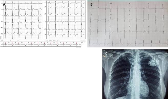 Figure 1: In the first panel (A) is the baseline electrocardiogram (ECG) of the patient with sinus rhythm, right bundle branch block, and 1:1 atrio-ventricular (AV) conduction. B) Shows the predischarge control ECG with unipolar stimulation and His capture, with normal intraventricular conduction (narrow QRS), and the chest film (C) showing the position of both electrodes prior to discharge. Note that the His electrode was located in the interatrial septum.
