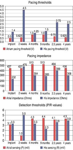 Figure 2: The different graphs show the chronic behavior of several electric parameters of the pacemaker: pacing threshold (volts), pacing impedance (Ohms), and detection thresholds (millivolts) during a four-year follow up.