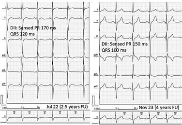 In the present case, since the PM implant, the patient has shown a satisfactory functional class and has had no syncope recurrence. Nonetheless, the stimulation thresholds have changed, and the RBBB has become apparent again unless a fine-tuning of the stimulation parameters (AV-delay, stimulation polarity, His output) achieves a selective capture pattern.