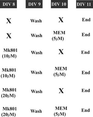 The study was designed with six groups: control group (CONTROL), Memantine group (MEM), MK801 at 10µM treatment group (MK801 (10µM)); MK801 at 10µM and posterior MEM treatment (MK801 (10µM) + MEM); MK801 at 20µM treatment group (MK801 (20µM)); MK801 at 20µM and posterior MEM treatment (MK801 (20µM) + MEM) (Figure 1). In addition, the time course of GluN2A and GluN2B subunits with no intervention drugs was recorded from DIV 8 to DIV 11 (Figure 2).