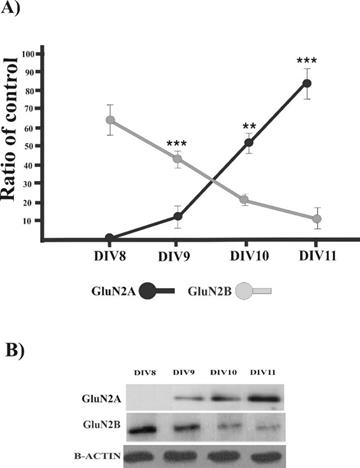 Figure 2. Time course of GluN2A and GluN2B subunits NMDAR subunits are exchanged in vitro during the early phases of neuronal maturation. A) Time course evaluation of GluN2A and GluN2B expression. GluN2A subunits (black) presented a progressive increase while GluN2B subunits (grey) showed a progressive decrease during the incubation period. Significant differences with respect to the initial evaluation condition were identified from 9 to 11 DIV for both NMDAR subunits. B) Representative western blots. N=5 experiments analyzed in triplicate. Values are mean +- SDand analyzed by non-parametric Mann Whitney test. **P<0.01 and***P<0.005 for differences between pairs of groups.